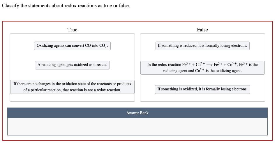 Solved Classify The Statements About Redox Reactions As True Chegg Com
